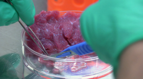 Viande in vitro – bribes de muscle, récoltés et stockés au congélateur.